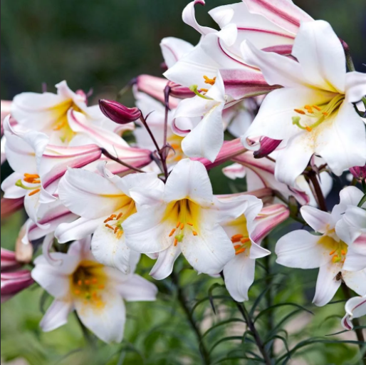 Лилия Регале – это настоящий королевский цветок. Отличается гигантскими цветками, смотрящими вниз, как колокол. Один такой колокол может заменить целый букет изящных цветов. Лилия обладает уникальным ароматом, который растекается по всему саду. Высота растения: от 50 см до 2,5 м. Зимостойкость: -35°С. Время цветения: июль — сентябрь.